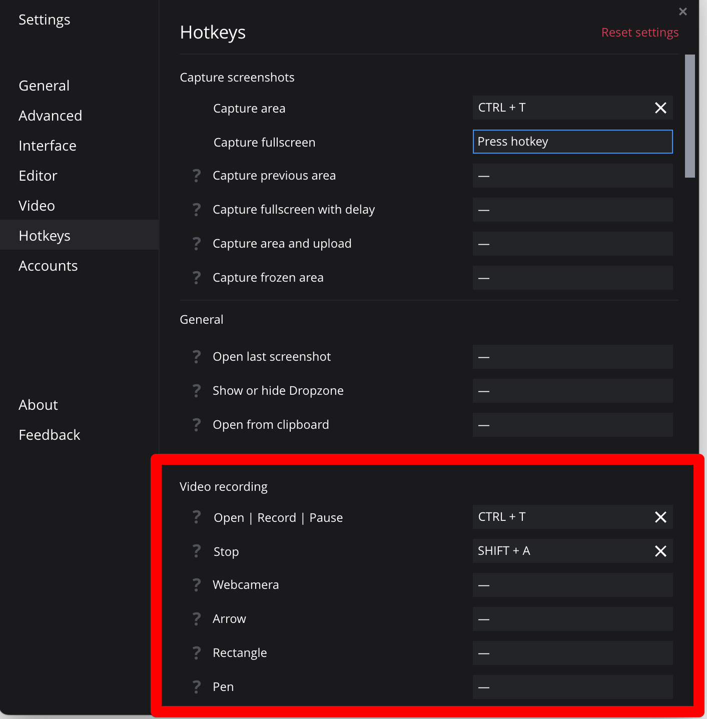 In the Monosnap Settings > Hotkeys, you can set up hotkeys for all available video options.