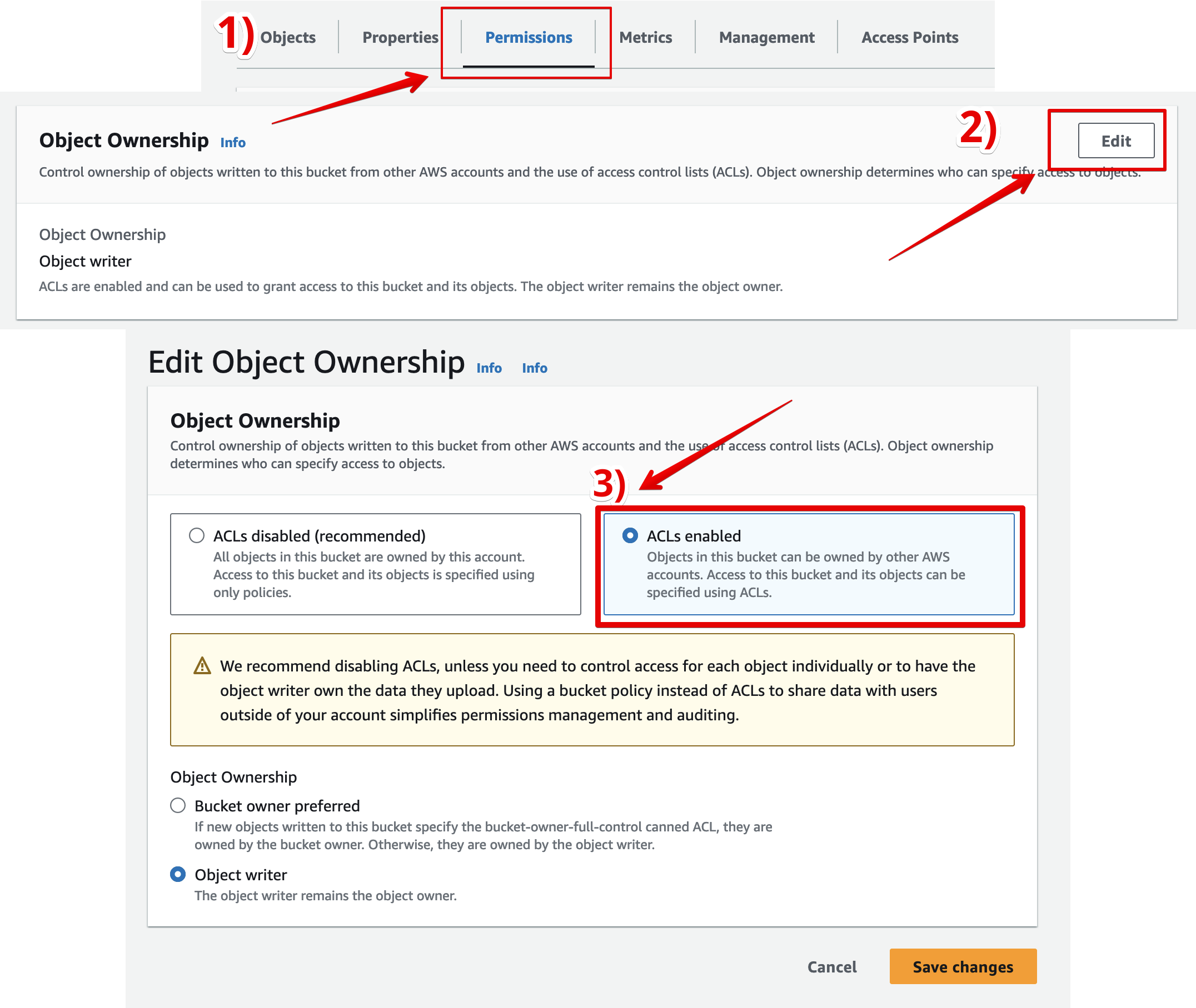 9️⃣ Don't forget to check your S3 bucket -> Permissions -> Object Ownership and make sure, that ACL is enabled: